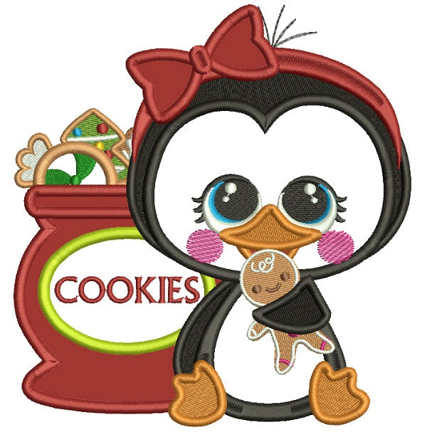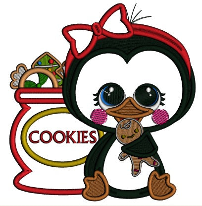 Penguin Holding Gingerbread Man Next To Bag Of Cookies Applique Christmas Machine Embroidery Design Digitized Pattern