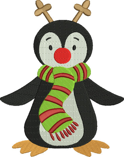 Penguin with a scarf and red nose Christmas Filled Machine Embroidery Digitized Design Pattern