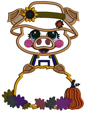 Piggy Farmer Wearing Hat With Sunflower Applique Filled Machine Embroidery Design Digitized Pattern
