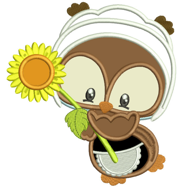 Pilgrim Owl Girl With Sunflower Thanksgiving Applique Machine Embroidery Digitized Design Pattern