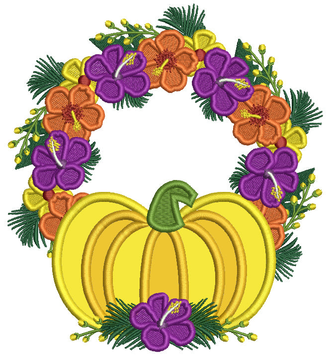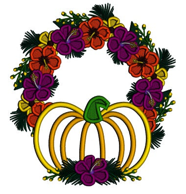 Pumpkin And Fall Flowers Wreath Applique Machine Embroidery Design Digitized Pattern