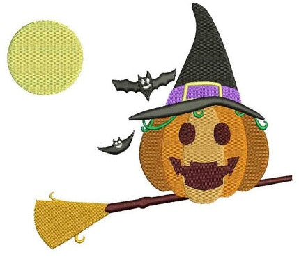 Pumpkin on a broom Halloween Filled Machine Embroidery Digitized Pattern - Instant Download - 4x4 , 5x7, 6x10