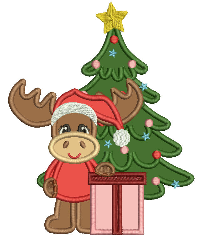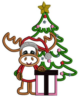 Reindeer With a Big Present Standing Next To Christmas Tree Applique Machine Embroidery Design Digitized Pattern