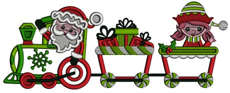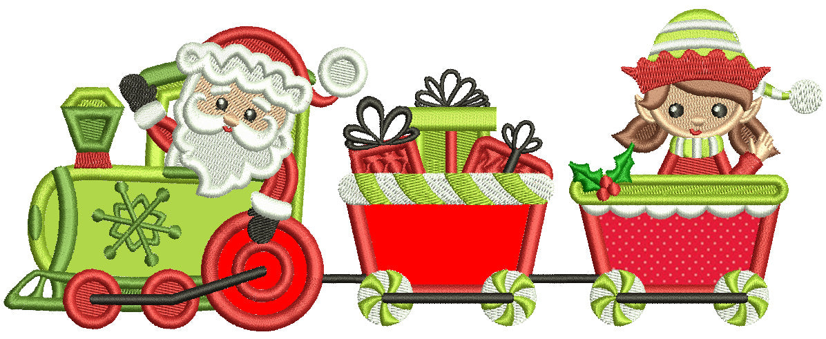 Santa And Elf Girl Riding a Train Christmas Applique Machine Embroidery Design Digitized Pattern