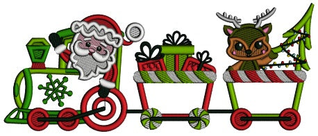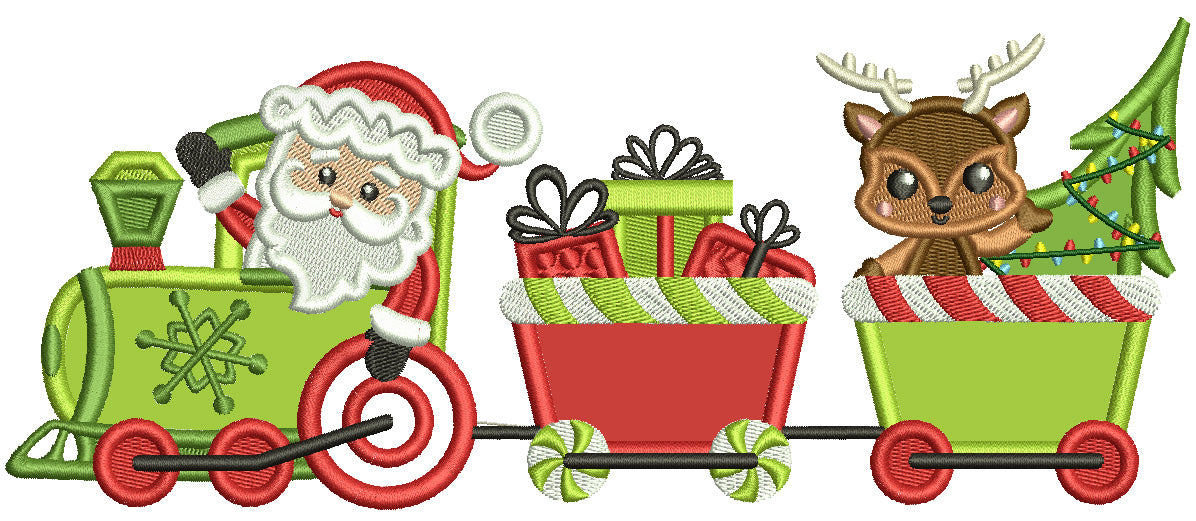 Santa And Reindeer Riding a Train Christmas Applique Machine Embroidery Design Digitized Pattern