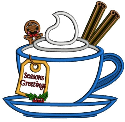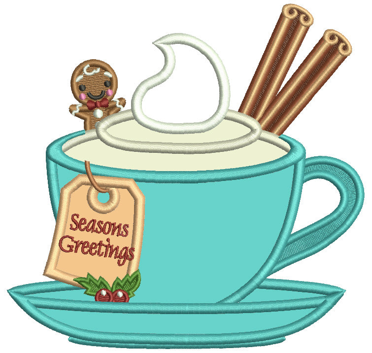Season Greetings Gingerbread And Cup Of Cocoa Christmas Applique Machine Embroidery Design Digitized Pattern