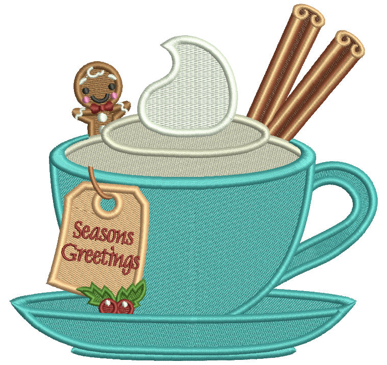 Season Greetings Gingerbread And Cup Of Cocoa Christmas Filled Machine Embroidery Design Digitized Pattern