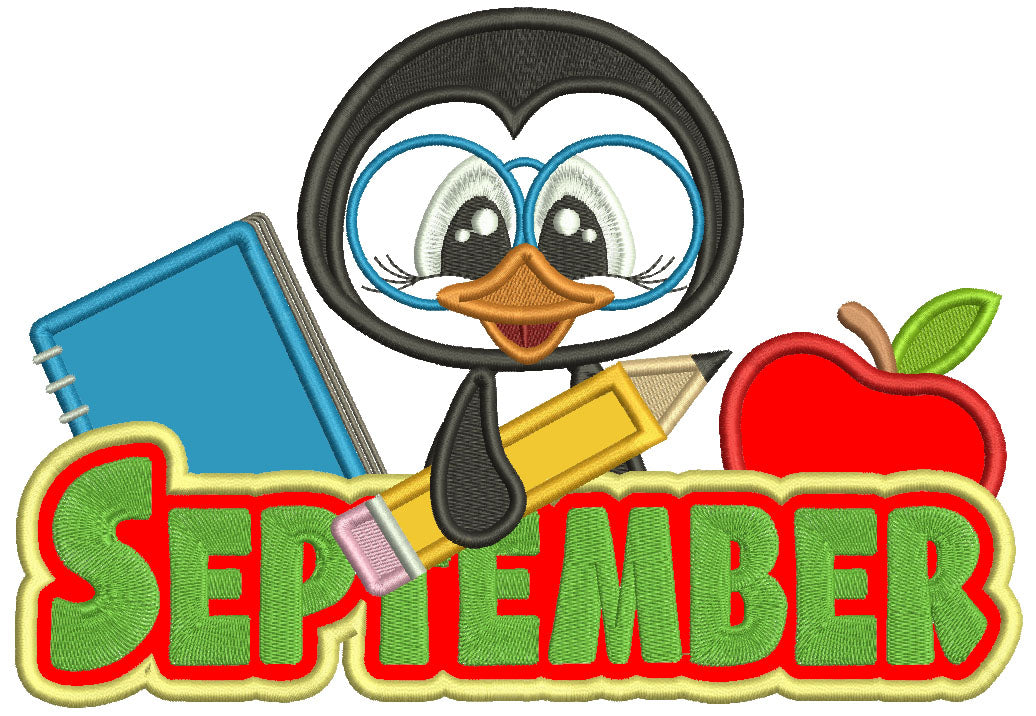 September Penguin Holding a Pencil School Applique Machine Embroidery Design Digitized Pattern