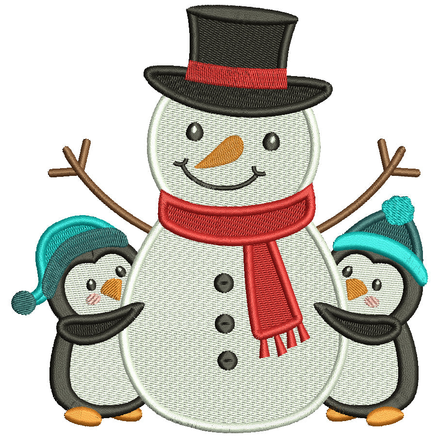Snowman and Two Penguins Christmas Filled Machine Embroidery Design Digitized Pattern