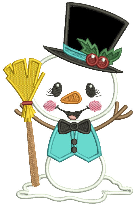 Snowman Holding a Broom And Wearing Big Hat Applique Machine Embroidery Design Digitized Pattern