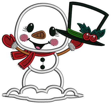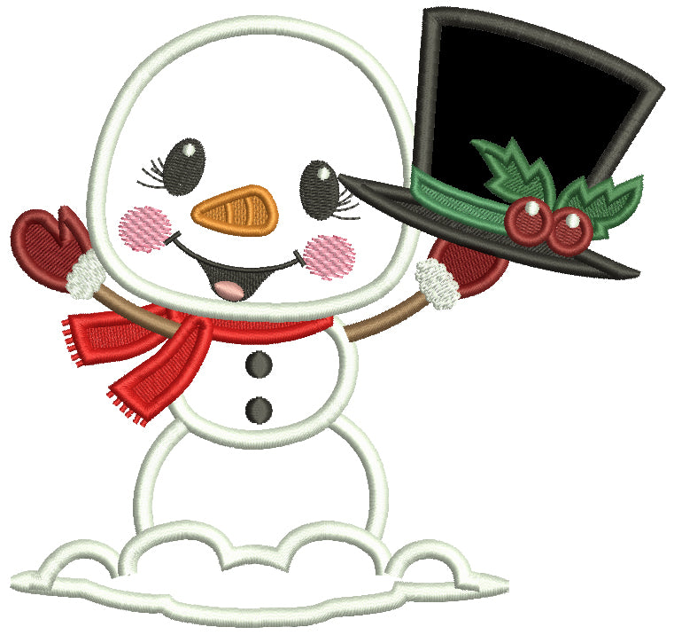 Snowman Holding Big Hat Christmas Applique Machine Embroidery Design Digitized Pattern