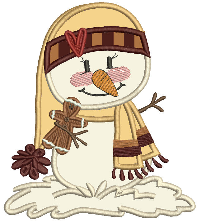 Snowman Wearing Scarf And a Hat Holding Gingerbread Man Christmas Applique Machine Embroidery Design Digitized Pattern
