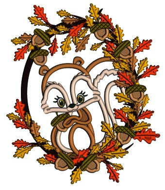 Squirrel Sitting On a Wreath WIth Acorns And Fall Leaves Applique Machine Embroidery Design Digitized Pattern