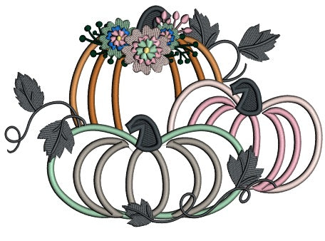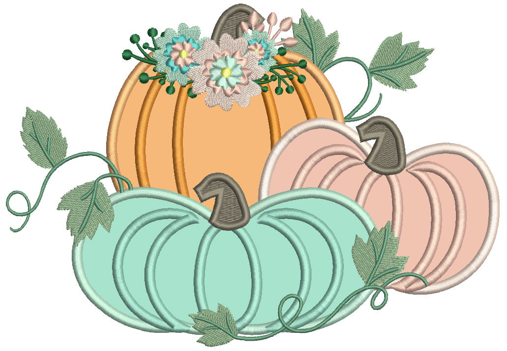 Three Beautiful Pumpkins With Flowers Applique Machine Embroidery Design Digitized Pattern