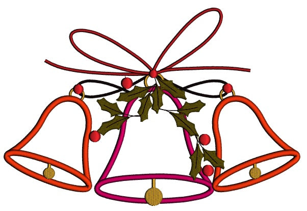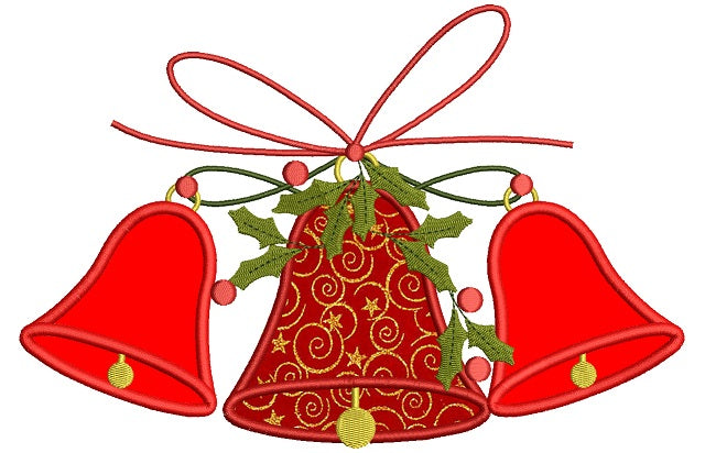 Three Christmas Bells With Ribbon Applique Machine Embroidery Design Digitized Pattern