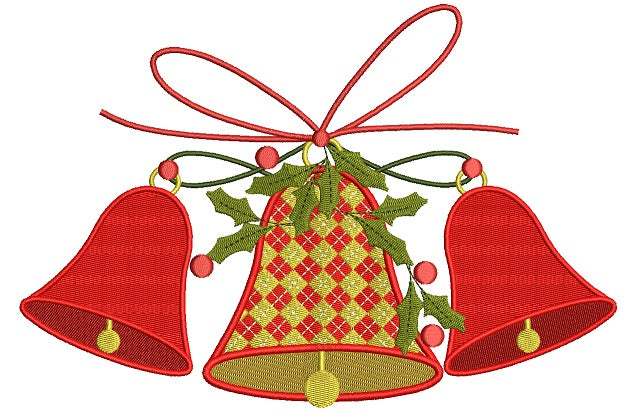 Three Christmas Bells With Ribbon Filled Machine Embroidery Design Digitized Pattern