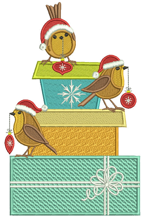 Three Little Birds Sitting On Christmas Presents Filled Machine Embroidery Design Digitized Pattern