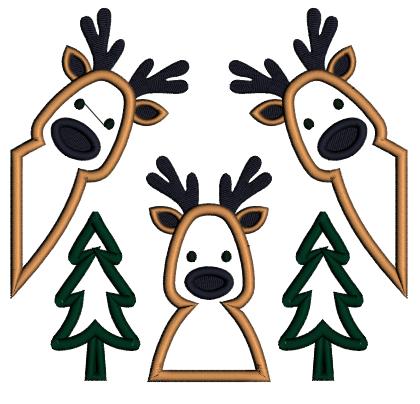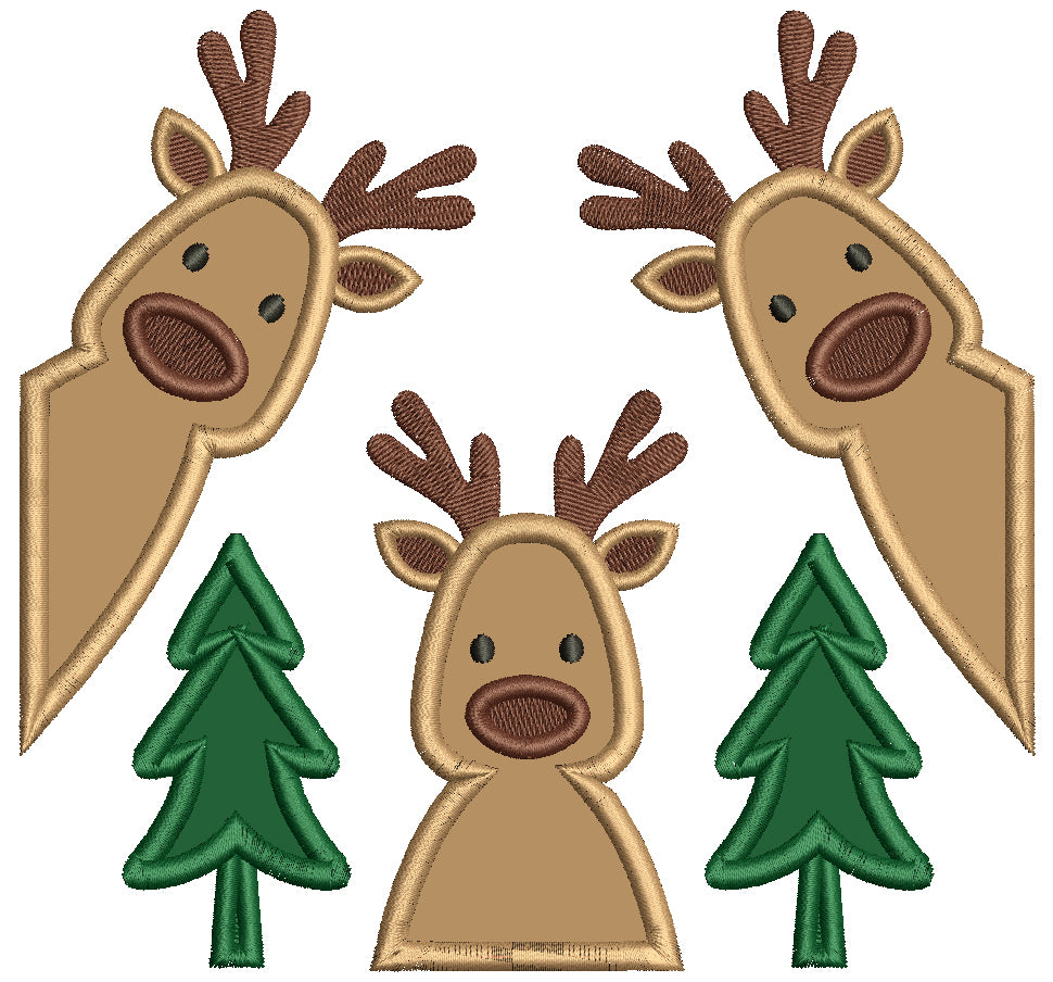 Three Reindeer and Christmas Trees Applique Machine Embroidery Design Digitized Pattern