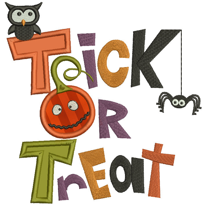 Trick or Treat Pumpking Owl and a Spider Halloween Applique Machine Embroidery Digitized Design Pattern