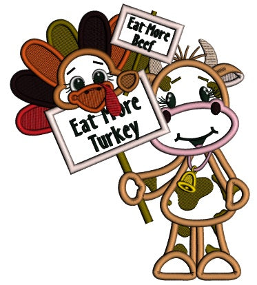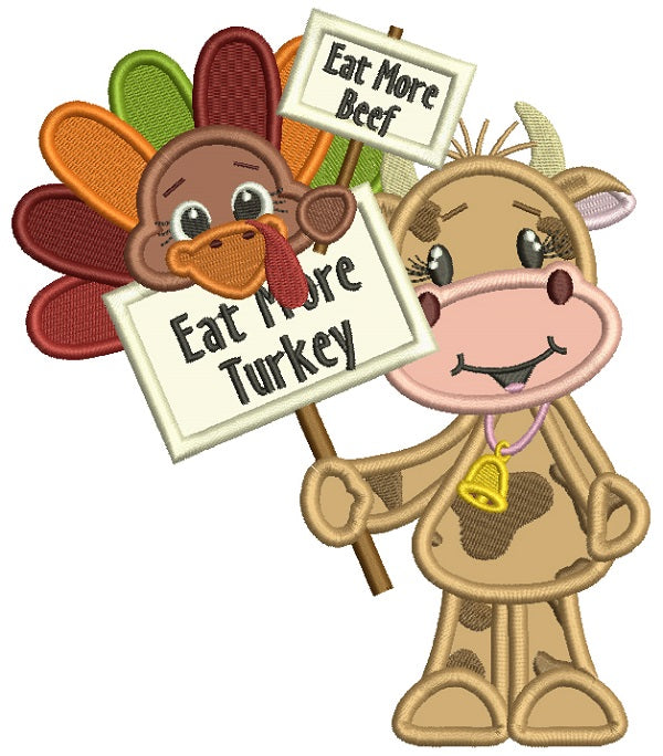 Turkey Holding Signs Eat More Beef While Cow Is Holding Sign Eat More Turkey Thanksgiving Applique Machine Embroidery Design Digitized Pattern
