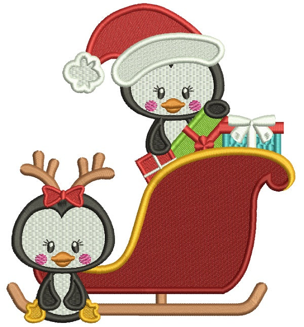 Two Penguins Sitting Inside Christmas Sleigh Filled Machine Embroidery Design Digitized Pattern