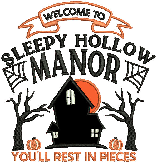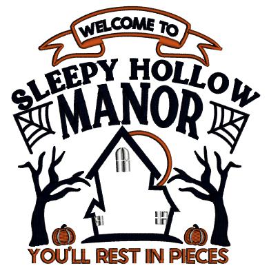 Welcome To Sleepy Hollow Manor You'll Rest In Pieces Haunted House Halloween Applique Machine Embroidery Design Digitized Pattern