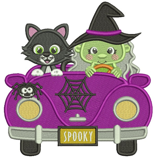 Witch and Black Cat Driving a Car Halloween Filled Machine Embroidery Design Digitized Pattern